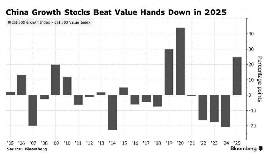 根据统计机构汇编的数据,中国沪深300成长指数(CSI 300 Growth Index)今年以来的指数级表现已超过沪深300价值指数大约25个百分点,有望创下近二十年来的最佳年度超额收益表现。